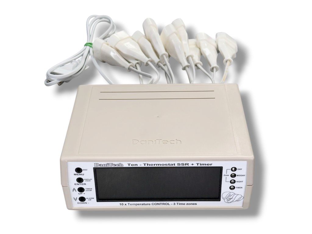 DaniTech 10T není běžný termostat. Jedná se o pokročilou řídicí jednotku, která umožňuje současně měřit a regulovat teplotu až v deseti různých místech. Díky tomu máte absolutní kontrolu nad prostředím i ve velmi rozsáhlých a náročných instalacích, kde běžné termostaty selhávají.